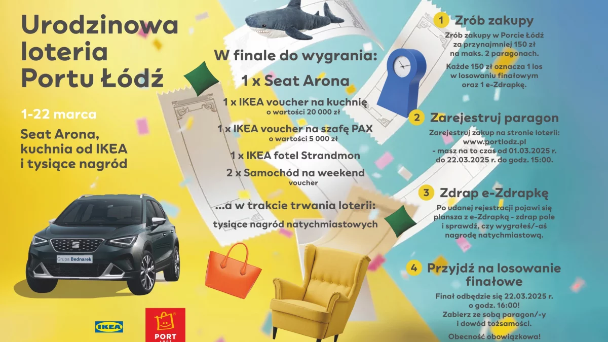 Zachęcamy do zabawy – im więcej zgłoszeń, tym większa szansa na wygraną! To doskonała okazja, by połączyć przyjemne zakupy z możliwością zdobycia wyjątkowych nagród. Wielkie losowanie finałowe odbędzie się 22 marca o 16:00 w Porcie Łódź – warto być tam i przeżyć emocje na żywo! Trzeba pamiętać, by mieć ze sobą zarejestrowane paragony i dowód osobisty.