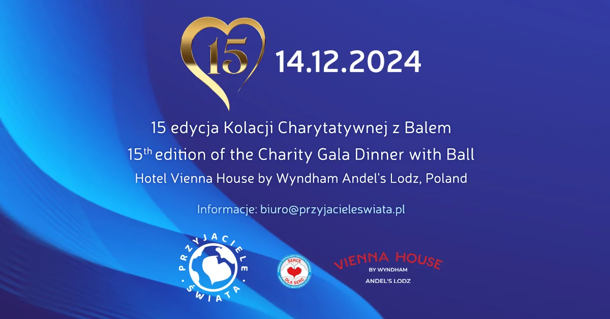 Już po raz piętnasty łodzianie spotkają się na niezwykłym wydarzeniu, które połączy szczytny cel z niezapomnianą atmosferą. Kolacja Charytatywna z Balem organizowana przez Stowarzyszenie „Przyjaciele Świata” i Fundację „Serce dla Serc” to wyjątkowa okazja, by wspólnie pomagać potrzebującym, a zarazem uczestniczyć w jednym z najbardziej prestiżowych wydarzeń towarzyskich w Łodzi. Wydarzenie objęte jest patronatem honorowym Prezydent Miasta Łodzi, Pani Hanny Zdanowskiej, Rektora Uniwersytetu Medycznego w Łodzi, prof. dr. hab. n. med. Janusza Piekarskiego oraz Prezesa Okręgowej Rady Lekarskiej w Łodzi, dr. n. med. Pawła Czekalskiego.