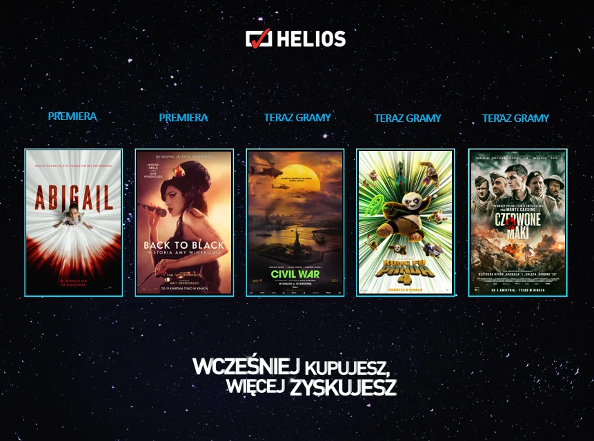 Szczegóły dotyczące seansów w nadchodzącym repertuarze oraz bilety można znaleźć na stronie www.helios.pl, w aplikacji mobilnej oraz w kasach kinowych w całej Polsce. Dokonując zakupu wcześniej, można wybrać najlepsze miejsca, a także – zaoszczędzić.