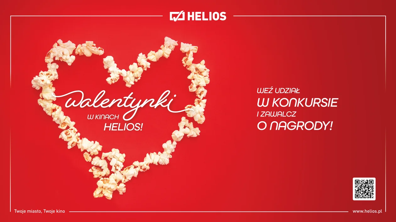 Helios zaprasza na seanse oraz do udziału w okolicznościowym konkursie. Aby zdobyć jedną z nagród, należy napisać walentynkową rymowankę, wplatając w nią tytuł ulubionego filmu o miłości oraz nazwę sieci: Helios. Najciekawsze propozycje zostaną nagrodzone Zestawami Kinomana dla dwojga, zawierającymi dwa bilety i zestaw barowy! Zgłoszenia można nadsyłać do 18 lutego włącznie.