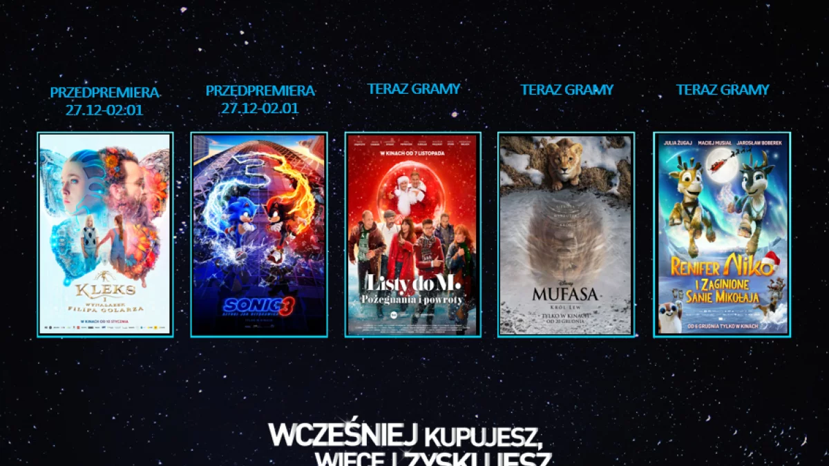 Nadal można wybrać się do kin na ciepłą komedię romantyczną „Listy do M. Pożegnania i powroty”, ukazującą przeżywanie świątecznego czasu na odmienne sposoby. Tradycyjnie w ukazanych historiach przewija się wątek poszukiwania miłości i przyjaźni. Innym filmem w klimacie gwiazdki jest animacja „Renifer Niko i zaginione sanie Mikołaja”. Zaledwie dzień przed Wigilią dzielny bohater musi odnaleźć sanie samego Świętego Mikołaja – te zniknęły za sprawą zawadiackiej reniferki, Stelli… Niko wspólnie z przyjaciółmi – wiewiórką Juliuszem i łasicą Wilmą – ruszają jej śladem.