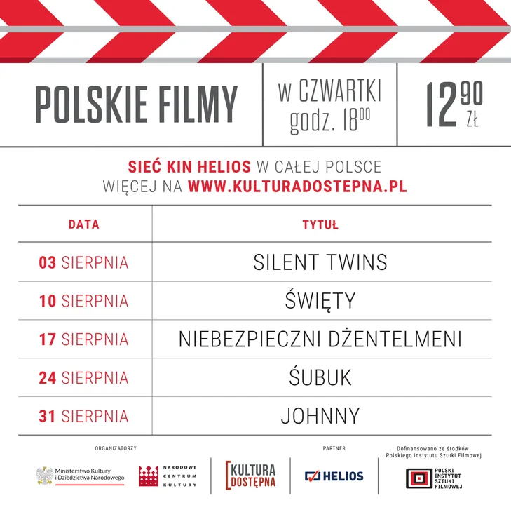 „Kultura Dostępna w kinach” to projekt Narodowego Centrum Kultury, które wraz z siecią kin Helios zachęca Polaków do oglądania rodzimych produkcji w kinowej jakości. Dzięki dostępności kin w całym kraju oraz przystępnej cenie biletu, projekt zyskał grono stałych odbiorców i fanów dobrego polskiego kina. Projekt dofinansowano ze środków Polskiego Instytutu Sztuki Filmowej. Szczegóły oraz bilety dostępne są pod adresem: www.helios.pl/kultura_dostepna.