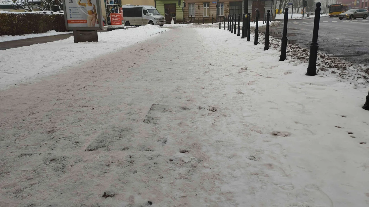 Mimo że śnieg leży od ładnych kilku dni, w wielu miejscach wciąż nie jest odgarnięty. Taka wymieszana z błotem i piaskiem masa zalegająca na chodniku jest dla pieszego nie lada wyzwaniem. Żeby przez nią przebrnąć, trzeba iść powoli i uważać, bo łatwo można stracić równowagę i się poślizgnąć. Nie jest łatwo zwłaszcza osobom, które mają kłopoty z przemieszczaniem się, podpierają się kulą. Przepchnąć wózek z dzieckiem przez taki chodnik też trzeba mieć siłę.