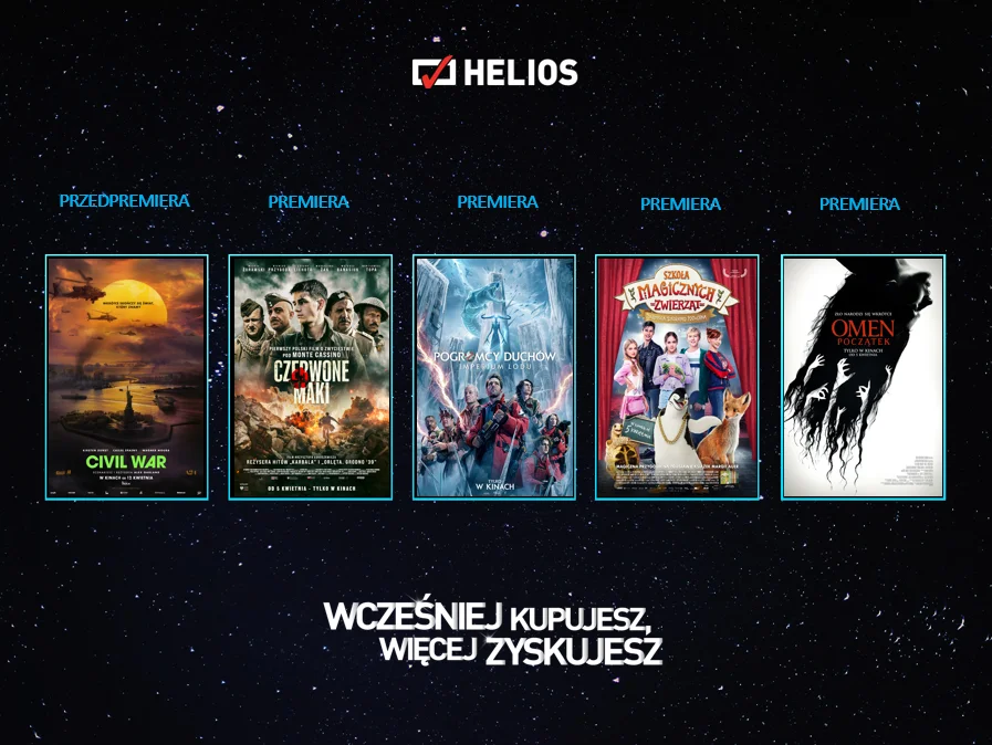 Szczegóły dotyczące seansów w nadchodzącym repertuarze oraz bilety można znaleźć na stronie www.helios.pl, w aplikacji mobilnej oraz w kasach kinowych w całej Polsce. Dokonując zakupu wcześniej, można wybrać najlepsze miejsca, a także – zaoszczędzić.