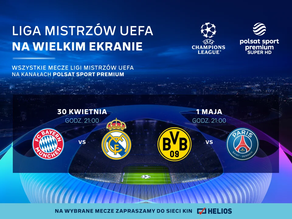 Na ostatni dzień kwietnia zaplanowano spotkanie Bayernu Monachium z Realem Madryt. Mistrzowie Niemiec, choć nie mają już szans na ponowną obronę tytułu, mogą powalczyć o jak najlepszy rezultat w międzynarodowych rozgrywkach. Pierwszy dzień maja to z kolei ważny dzień dla kibiców Borussi Dortmund i PSG. Zwłaszcza sympatycy tego ostatniego, po sensacyjnych rozstrzygnięciach z ćwierćfinału i wyeliminowaniu FC Barcelona, mogą spodziewać się kolejnego emocjonującego spotkania. Natomiast odbywające się tydzień później rewanże rozstrzygną, kto może rezerwować bilety na lot do Londynu. Wielki finał już 1 czerwca, a jego transmisja również zagości na ekranach kin Helios!