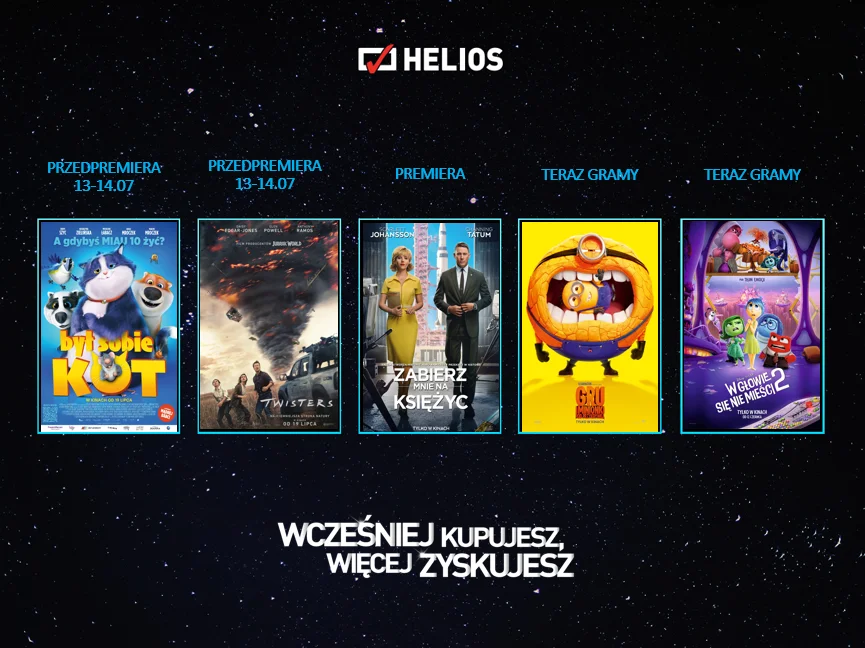 Szczegóły dotyczące nadchodzących seansów oraz bilety na wszystkie pokazy można znaleźć na stronie www.helios.pl, w aplikacji mobilnej oraz w kasach kinowych w całej Polsce. Dokonując zakupu wcześniej, można wybrać najlepsze miejsca, a także – zaoszczędzić. Helios przypomina o trwającym wakacyjnym konkursie „Aktywne lato” – więcej informacji znajduje się na stronie: www.helios.pl/aktualnosc/lato24.