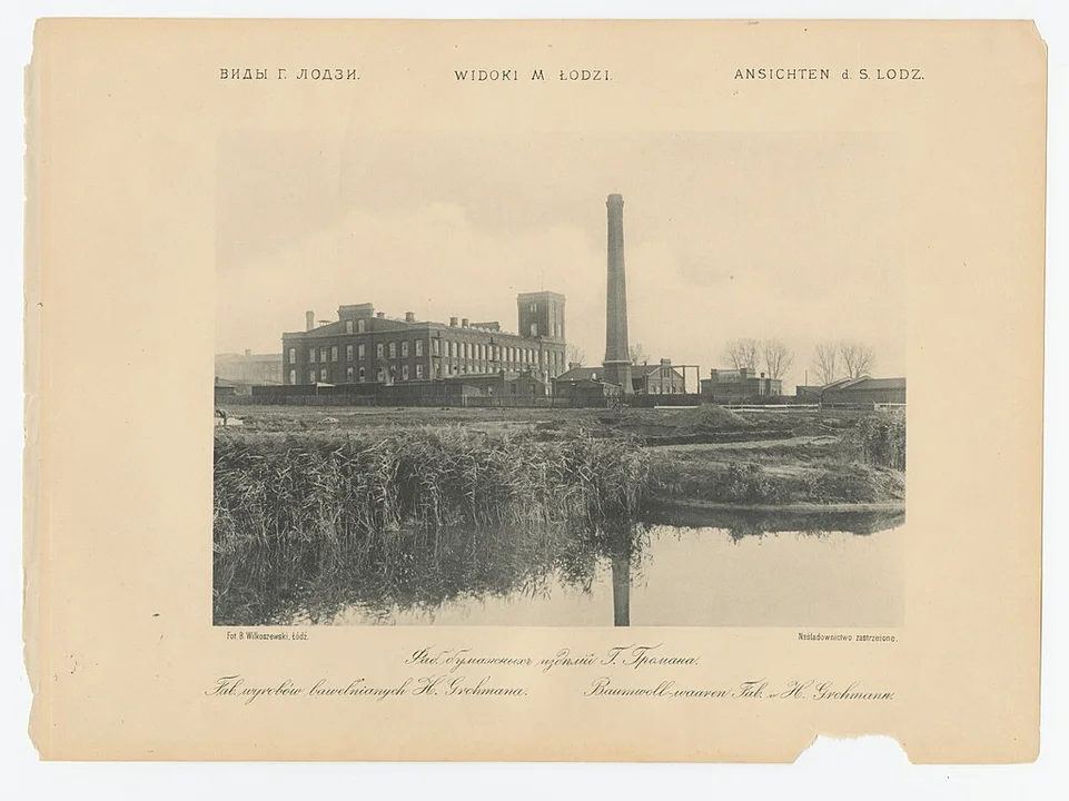 Główna fotografia w galerii przedstawia fabrykę wyrobów bawełnianych Henryka Grohmana. Została ona wybudowana w 1889 roku przy ulicy Emilii (obecnie ulica Tymienieckiego 22/24), obok fabryki ojca Henryka Grohmana, Ludwika. Autorem projektu był architekt Hilary Majewski, który zastosował w stylistyce kompleksu różnorodne style architektoniczne, od gotyku do renesansu. Rodzina Grohmanów od 1842 roku zajmowała się w Łodzi produkcją wyrobów bawełnianych. Traugott Grohmann przejął w wieczystą dzierżawę posiadło wodno-fabryczne „Lamus” i wybudował fabrykę, którą jego syn Ludwik przekształcił w zakłady „Ludwik Grohman”. Po śmierci ojca, w 1889 roku prowadzenie firmy przejął Henryk Grohman, który rozbudował zakład i postawił nowoczesny, wielowydziałowy kombinat włókienniczy.Na następnych zdjęciach można zobaczyć również budynek Grand Hotelu mieszczący się przy ulicy Piotrkowskiej 72. W latach 60. XIX wieku właścicielem tej parceli został Edward Hentschel (Häntschel), który wyburzył znajdujące się tam parterowe drewniaki i w latach 1865-1868 postawił dwupiętrowy budynek mieszkalny ze składem towarów. W oficynach rozpoczęła działanie fabryka produkująca materiały wełniane: flanele, koce, chusty. W 1874 roku spłonęła część zabudowań fabrycznych i Hentschel sprzedał nieruchomość swojemu pracownikowi i zięciowi Ludwikowi Meyerowi. Nowy właściciel wraz ze swoim współpracownikiem i późniejszym szwagrem Juliuszem Kunitzerem odbudował w 1875 roku fabrykę i wznowił produkcję. Po kilku latach działań w latach 80. XIX wieku Ludwik Meyer przejął udziały Juliusza Kunitzera i przeniósł fabrykę do podłódzkiej osady leśnej Mania. Budynek przy Piotrkowskiej przebudował i 9 października 1887 roku otworzył „Grand Hotel”.