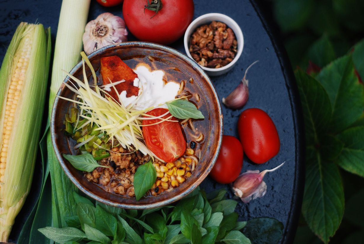 Addio Pomidory – miso, suszone pomidory, orzechy włoskie, makaron alkaliczny, bulion: trawa cytrynowa, kaffir, pomidory, kiszony pomidor, por, wędzony tempeh, grillowana kukurydza, dynia betty blue, puder z pomidorów, śmietana kokosowa, bazylia tajska