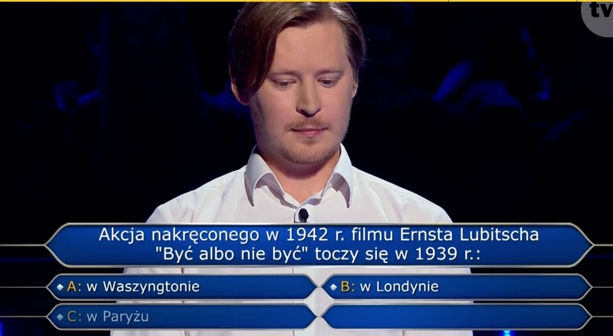 Akcja, nakręconego w 1942 r. filmu Ernsta Lubitscha "Być albo nie być", toczy się w 1939 r.: A. w Waszyngtonie; B. w Londynie; C. w Paryżu; D. w Warszawie - przeczytał pytanie Michał Ubrański.