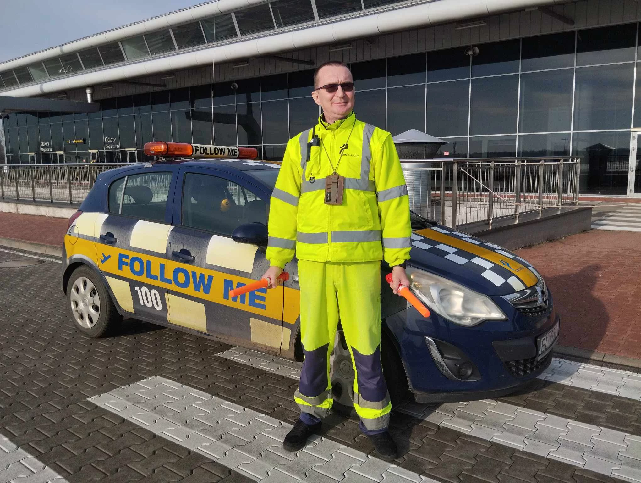 Na łódzkim lotnisku pracuje w sumie 5 "followków". To sami panowie. Zwykle jest ich po dwóch na zmianie. Jeden wskazuje latarkami pilotowi manewry, drugi w aucie osobowym pilotuje samolot.