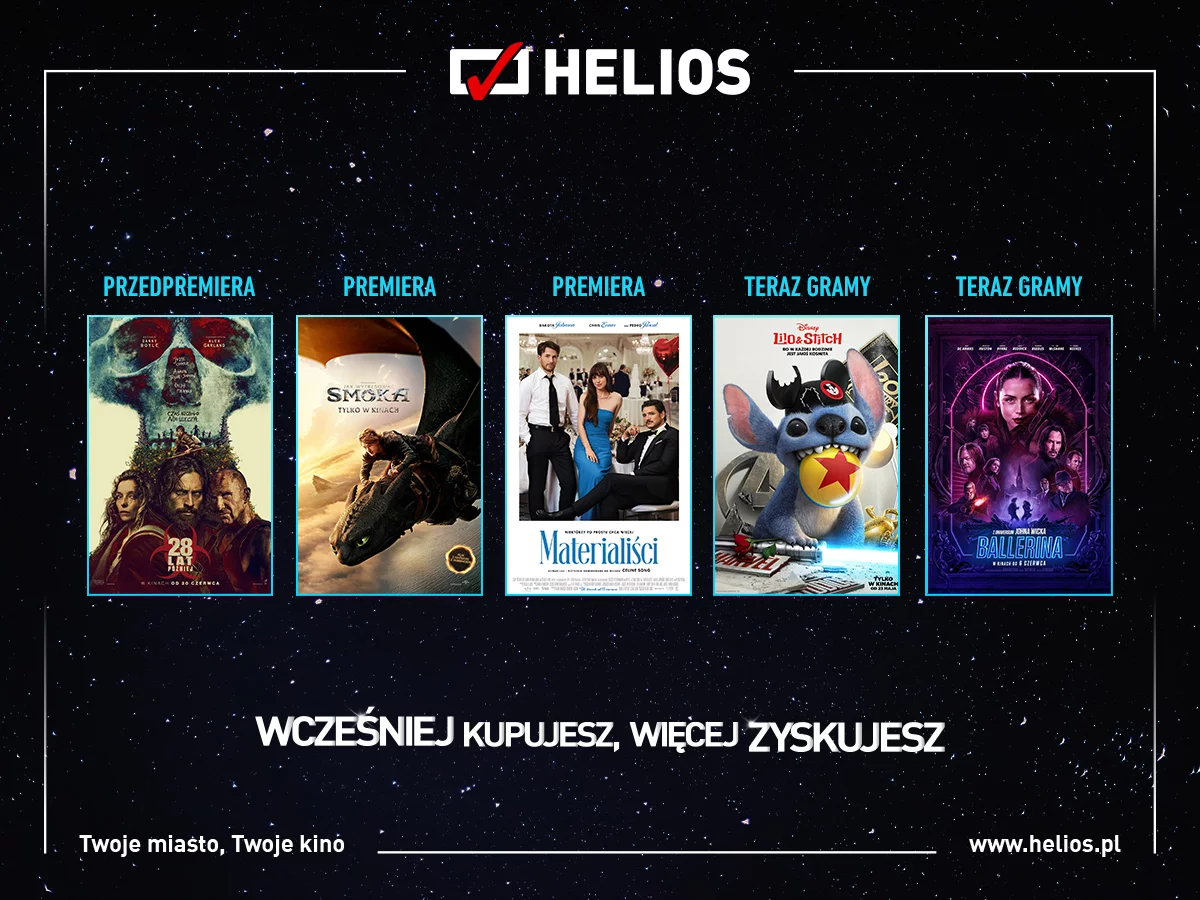 Ponadto w czwartek, 19 czerwca w kinach Helios odbędą się przedpremierowe projekcje produkcji „28 lat później” w reżyserii Danny’ego Boyle’a. To trzecia część serii o tematyce postapokaliptycznej, w której jeden z ocalałych po epidemii groźnego wirusa opuszcza bezpieczną wyspę i udaje się na stały ląd, gdzie odkrywa mroczne tajemnice…