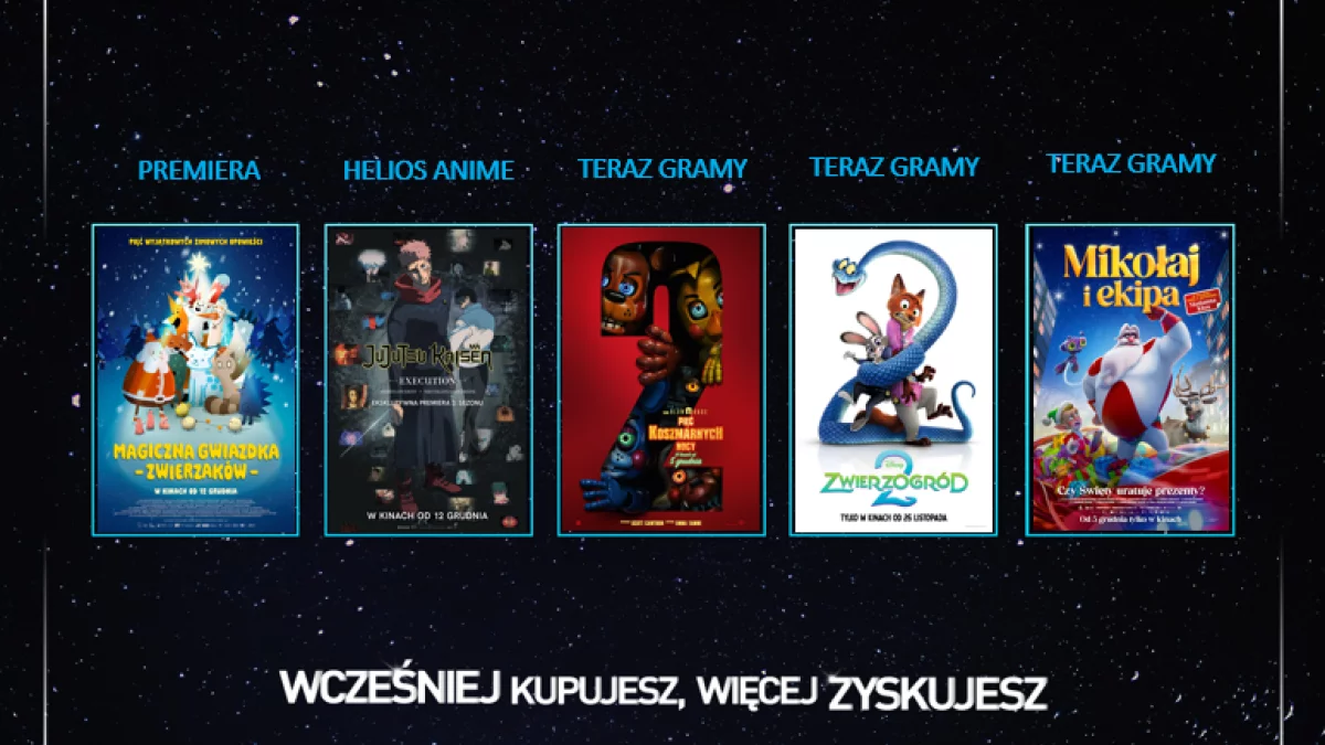 Sieć przygotowała również seanse dla fanów japońskiej animacji w ramach cyklu Helios Anime. W dniach 12-18 grudnia we wszystkich kinach odbędą się projekcje tytułu „Jujutsu Kaisen: Execution Shibuya Incident x The Culling Game Begins”. Kulminacją filmu, który podsumowuje dotychczasowe wydarzenia z serialu, jest dramatyczny pojedynek dwóch ulubionych uczniów Gojō. To wstęp do trzeciego sezonu anime, prezentowany przedpremierowo w kinach!