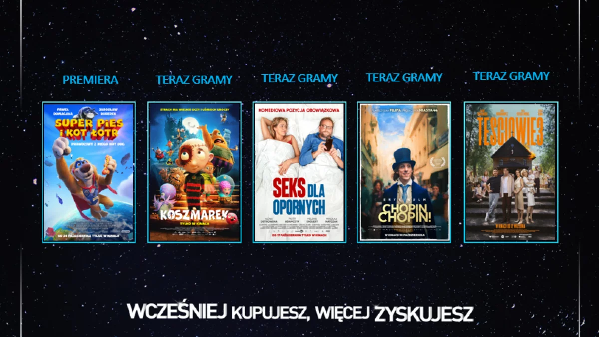 Od piątku, 24 października na wielkich ekranach będzie można obejrzeć najnowszą animację – „Super pies i kot łotr”. Opowiada ona o Dannym i jego psu Charliem. Czworonóg, dawniej bardzo żywiołowy, z wiekiem stracił jednak energię do zabawy. Wszystko zmienia się, gdy Charlie i kot sąsiada, Puszek, zostają porwani przez kosmitów, po czym zyskują supermoce. Charlie odzyskuje dawny wigor i staje się bohaterem pomagającym ludziom, natomiast Puszek wykorzystuje swoje moce do złych celów. Gdy zaczyna zagrażać światu, Danny i Charlie wyruszają na pełną emocji misję, by go powstrzymać! Ponadto w repertuarze zagoszczą największe filmowe hity ostatnich tygodni, do których należy „Chopin, Chopin!” – opowieść o najsłynniejszym polskim kompozytorze. 25-letni Chopin, pomimo śmiertelnej choroby, prowadzi intensywne życie: cieszy się wielką popularnością w towarzyskich kręgach, zachwyca talentem muzycznym i udziela lekcji gry na fortepianie. Jednocześnie coraz bardziej zdaje sobie sprawę z nieuchronnego przemijania. W tytułowego bohatera wciela się Eryk Kulm.