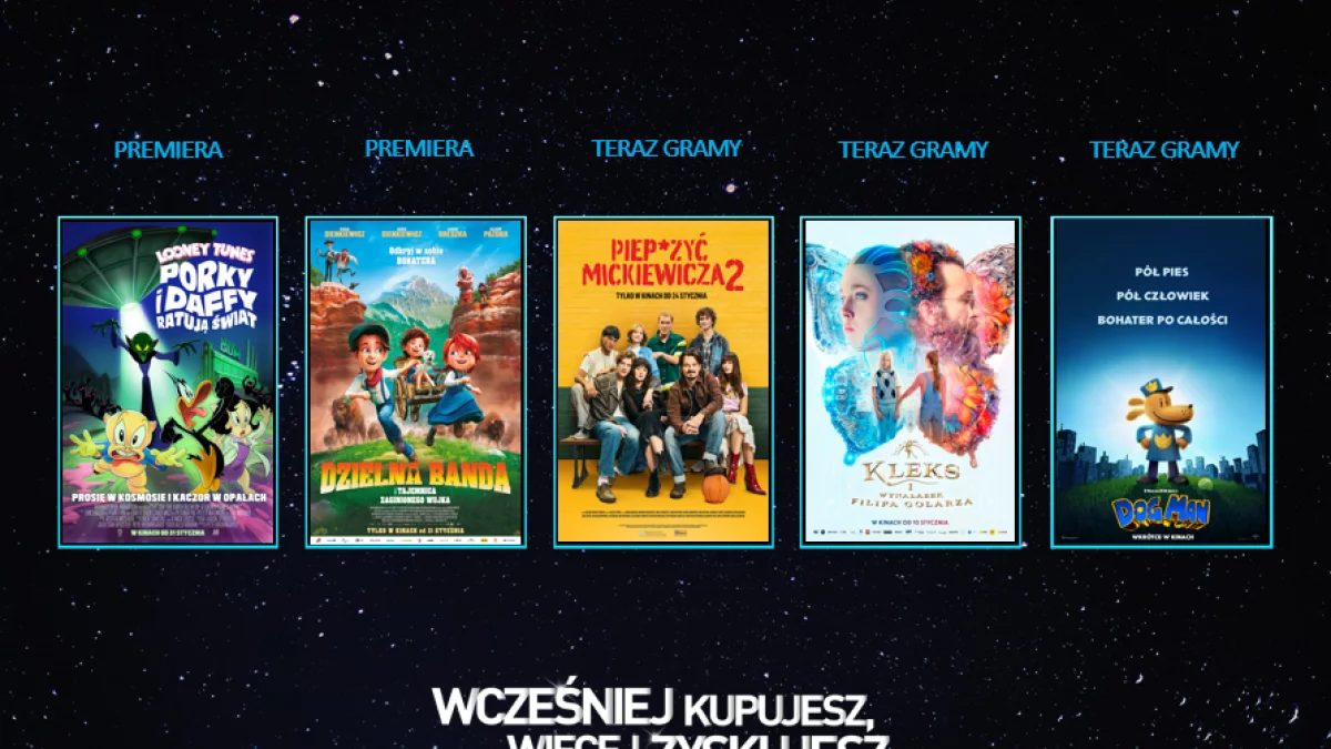 Kinomani w każdym wieku mogą obejrzeć zaskakującą animację „Dog Man”. Superzłoczyńca Petey klonuje samego siebie, aby jego powiodły się jego niecne plany. Sklonowany bohater wpada jednak w szpony wspólnego wroga, dlatego Dog Man i Petey niespodziewanie łączą siły i ruszają mu na pomoc! Nadal na wielkich ekranach można zobaczyć także kinowy przebój „Sonic 3. Szybki jak błyskawica”, w którym Sonic i jego przyjaciele nawiązują nietypowy sojusz z dawnym przeciwnikiem.