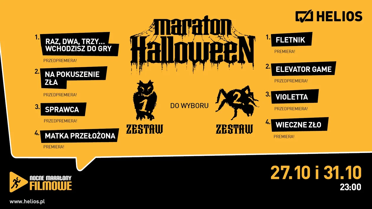 Dwie noce i dwa pakiety filmów – oto, co na Halloween przygotowała sieć kin Helios. W zestawie pierwszym fani horrorów będą mogli zobaczyć aż trzy przedpremiery. Na początku zostanie wyświetlony „Raz, dwa, trzy… wchodzisz do gry”, inspirowany dziecięcymi zabawami, jednak w śmiercionośnej wersji. Dalej widzowie będą mogli obejrzeć filmy „Na pokuszenie zła” i „Sprawca” – ten ostatni znalazł się w selekcji tegorocznego festiwalu w Berlinie. Na najwytrwalszych czeka makabryczna „Matka przełożona”…