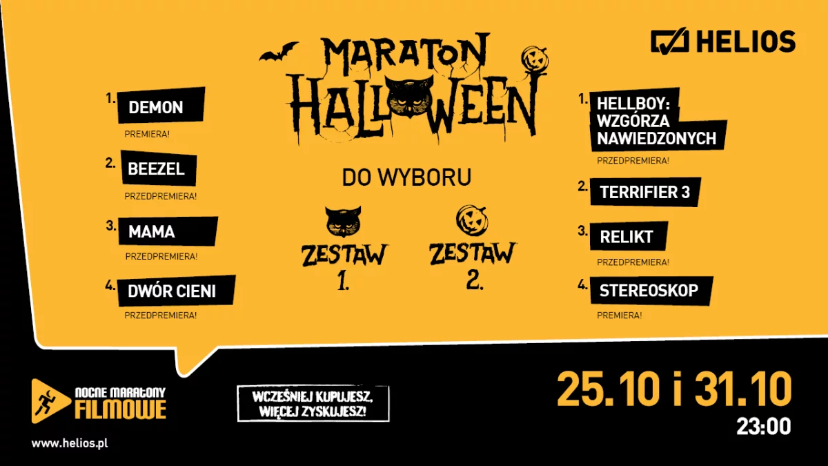 Dwie noce i dwa pakiety filmów – oto, co na Halloween przygotowała sieć kin Helios. W zestawie pierwszym na początku zostanie wyświetlony „Demon”, czyli opowieść o zemście na sprawcach potwornej krzywdy. Następnie fani horrorów będą mogli zobaczyć aż trzy przedpremiery: „Beezel” o nawiedzonym domu, w którym powstaje film dokumentalny, a potem „Mama” – historia kobiety pogrążającej się w obłędzie. Na najwytrwalszych czeka wstrząsający „Dwór cieni”…