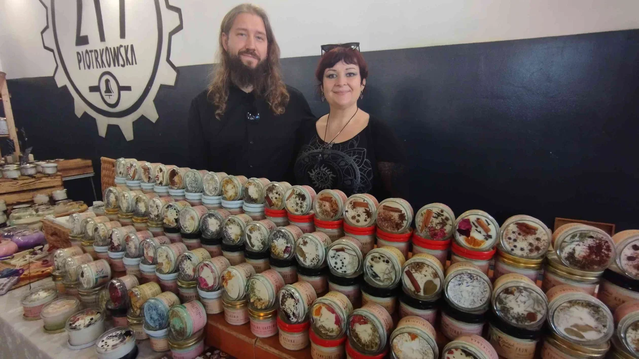 Joanna i Damian z Trzebnicy przyjechali na łódzkie targi, żeby pochwalić się ręcznie robionymi świecami z naturalnego wosku pszczelego z ziołami i kwiatami.