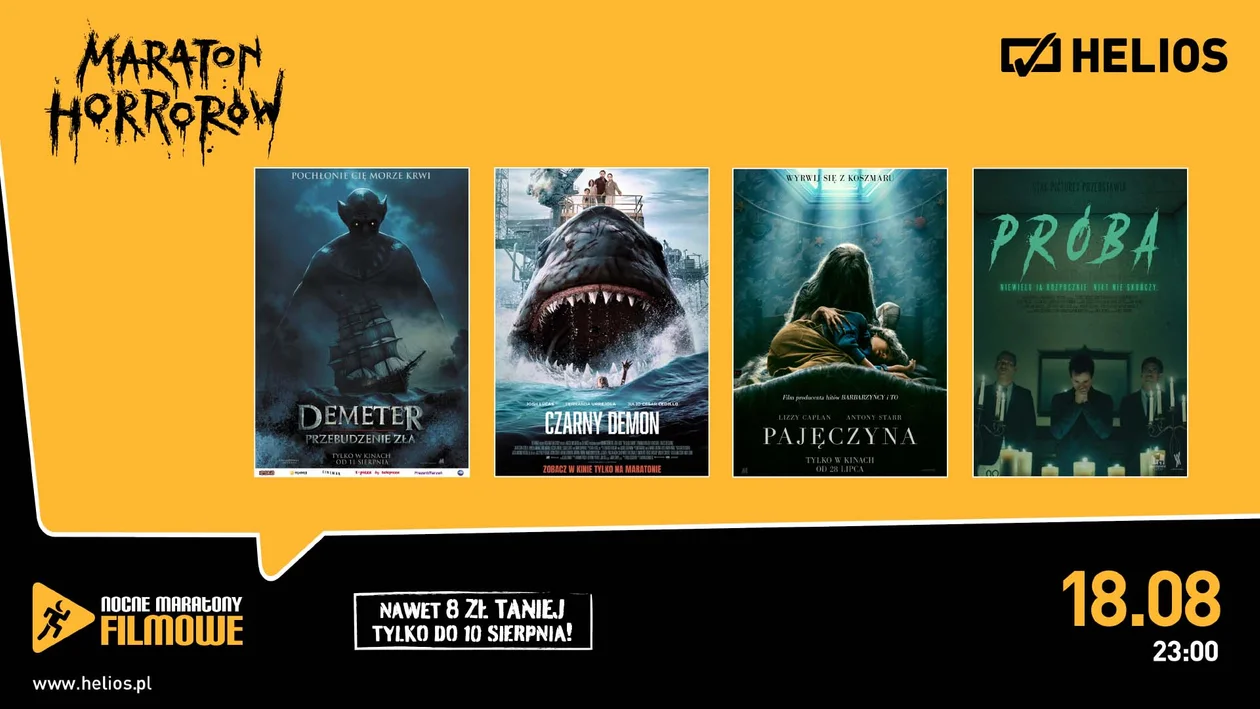 Jako pierwszy na wielkich ekranach wyświetlony zostanie film „DEMETER: PRZEBUDZENIE ZŁA”, czyli nowa interpretacja historii Drakuli. To jednak nie będzie spotkanie z wampirem jak w klasycznej opowieści, lecz na tytułowym statku Demeter, którym podróżował Drakula. Napięcie będzie narastało z każdą przebytą milą! Film jest premierą tego sierpnia, zatem to gorąca nowość. Dalej dryfując na morzu, tym razem przenosimy się na opuszczoną platformę wiertniczą. „CZARNY DEMON” to horror na podstawie meksykańskiej legendy, w której ojciec musi bronić rodziny przed żądną krwi morską bestią. Maraton będzie jedyną okazją do obejrzenia filmu w kinie! Następnie widzowie ujrzą kolejną tegoroczną nowość – „PAJĘCZYNA”, a na koniec na najodważniejszych czeka „PRÓBA”.