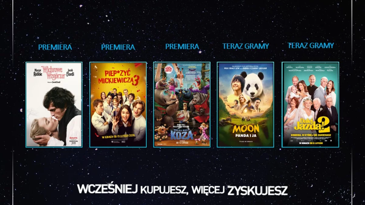 Święto zakochanych zbliża się wielkimi krokami, a kina zapraszają widzów na wyjątkowy, walentynkowy repertuar, w którym nie zabraknie wielkich emocji! Wśród premierowych propozycji na najbliższy tydzień znajdą się: „Wichrowe wzgórza”, „Piep*zyć Mickiewicza 3” oraz „Wielka mała koza”. Widzowie mogą również wybrać się na dwa Nocne Maratony Filmowe i wziąć udział w walentynkowym konkursie!