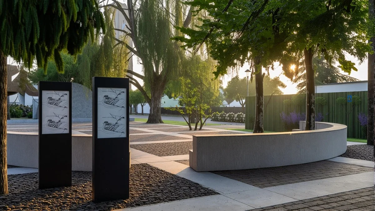 W centrum planuje się wykonanie fragmentów murów obronnych, bramy i ratusza z kamienia na wysokość maksymalnie 1,2 m nad ziemią, utwardzenie terenu kostką stylizowaną na starobruk, trawniki, posadzone zostaną drzewa i kwiaty. Stanie też punkt informacji turystycznej i toaleta. Będzie nowe oświetlenie, monitoring, stylizowane ławki parkowe, kosze na śmieci oraz makiety miasta.
