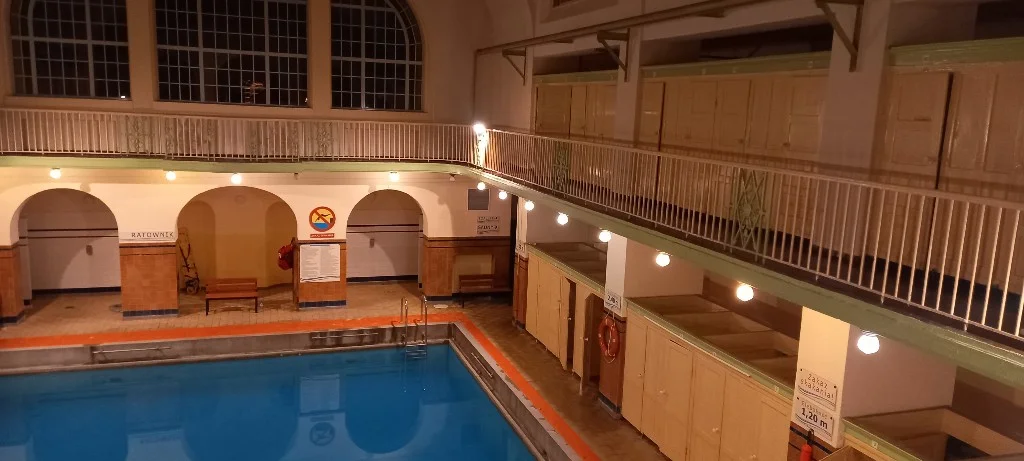We wnętrzu budynku przy samym basenie było naprawdę ciepło. W dalszym ciągu można w nim pływać. To, co było niespotykaną atrakcją podczas Zgierskiej Nocy Muzeów, to zwiedzanie podziemii tego miejsca. Tam było jeszcze goręcej. Mozna było obejrzec kotły oraz bardzo dużo starych sprzętów m.in. do podgrzewania wody czy tzw. łapacz włosów. Wycieczkę umilał przewodnik, który opowiadał o historii łażni w dużą dozą poczucia humoru.