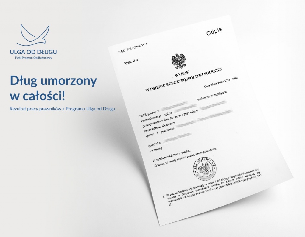 Prawnicy obsługujący klientów w Programie Ulga od Długu, prowadzą obecnie ponad 300 spraw sądowych. „Sprawa pani Hanny jest jednym z bardziej spektakularnych sukcesów. Sąd oddalił powództwo wierzyciela w całości, oznacza to, że dług pani Hanny został w całości umorzony. Otwiera to również nowe możliwości prowadzenia spraw w przypadku tego konkretnego wierzyciela” - wyjaśnia Dorota Wiszniewska, dyrektor obsługi prawnej Programu Ulga od Długu w kancelarii prawnej CERTO.
