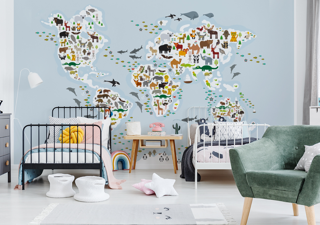 Do dziecięcej aranżacji także śmiało możemy wprowadzić geograficzny akcent. W tym wypadku jednak wzór musi być dopasowany zarówno do wieku, jak i do zainteresowań szkraba. Ekspert wybrał dla nas propozycję o uniwersalnym charakterze. Jak będzie się prezentować taka fototapeta? Mapa świata dla dzieci będzie wypełniona wizerunkami najrozmaitszych zwierzaków. Zaletą takiej dekoracji jest nie tylko jej efektowność. Oto, co powiedział nam ekspert: