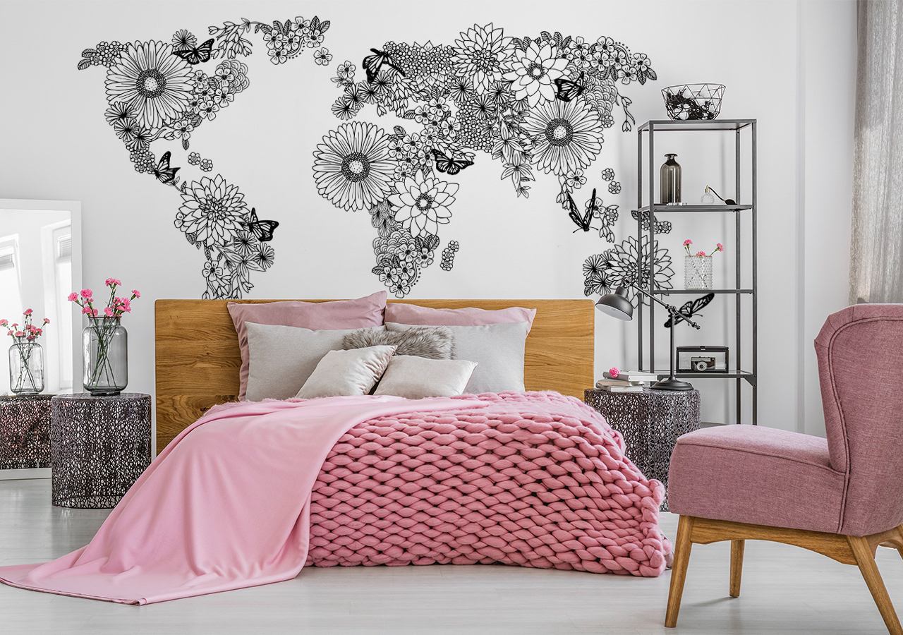 Jako baza do wszystkich trzech stylizacji posłuży nam mapa świata w postaci konturów wypełnionych rozmaitymi przedstawieniami i deseniami. Zacznijmy od oszczędnej w wyrazie aranżacji, w której rządzi zasada „less is more”. W takiej przestrzeni umieśćmy na ścianie wzór w postaci geometrycznej kompozycji. Lądy o krystalicznej, przypominającej biało-czarny witraż, formie będą pasować jak ulał. Do romantycznej sypialni z kolei mogę polecić floralny motyw dekoracyjny. Jeśli chcemy, by wystrój był usłany kwiatami, wybierzmy przedstawienie, na którym kontynenty wypełnione są różanym deseniem. Taka fototapeta umieszczona nad łóżkiem będzie się zachwycająco prezentować, zwłaszcza gdy cały pokój utrzymany jest w pastelowej tonacji. W eklektycznym wystroju możemy sobie pozwolić na dość dużą swobodę, bo estetyka ta polega na łączeniu ze sobą różnych stylów. Mój wybór padł na mapę utrzymaną w klimacie etno. Dzięki niej w pokoju zapanuje wakacyjna atmosfera.