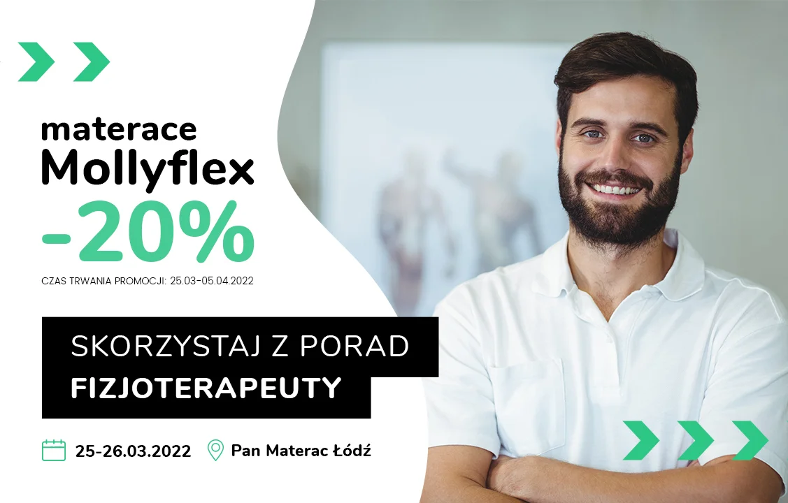 W obu salonach Pan Materac w Łodzi dostępny będzie wykwalifikowany fizjoterapeuta, który służy poradami dotyczącymi prawidłowego podparcia ciała i ułożenia kręgosłupa podczas snu. Przyjdź w dniach 25-26.03.2022 r. do salonów Pan Materac, skorzystaj z porad fizjoterapeuty oraz doradców Pan Materac i wybierz komfortowy materac Mollyflex w niezwykle korzystnej cenie! Zapraszamy!