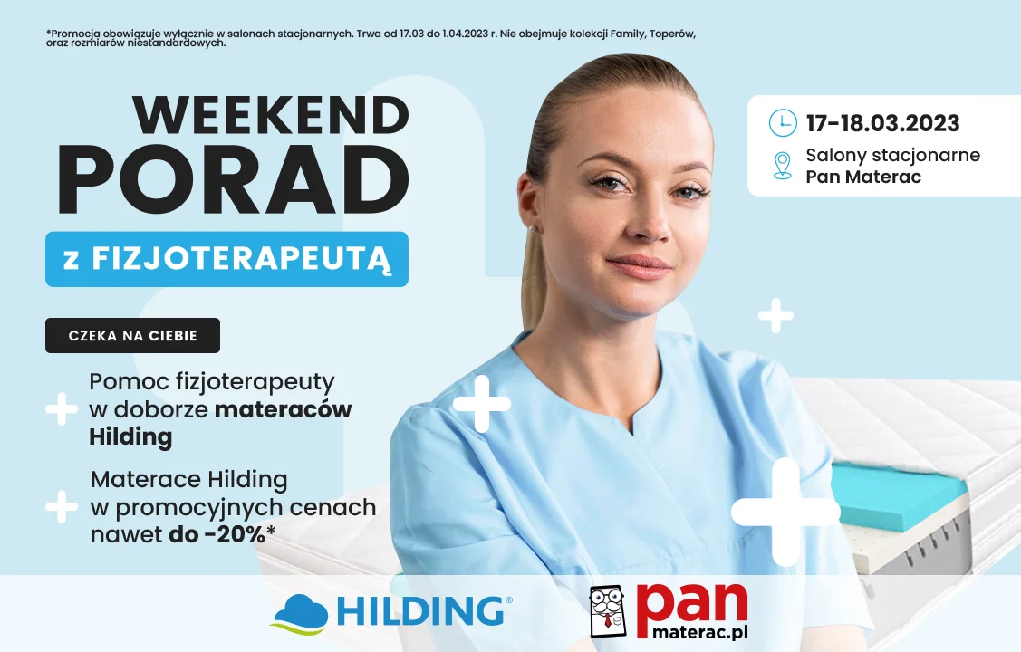 W dniach 17-18.03.2023 r. w salonach Pan Materac w Łodzi możesz skorzystać z darmowych konsultacji fizjoterapeutów, którzy pomogą Ci wybrać odpowiedni materac dla Twojego ciała i preferencji snu. Co więcej, od najbliższego weekendu obniżone zostają ceny popularnych materacy marki Hilding i Pan Materac, dzięki którym możesz zaoszczędzić na zakupie swojego wymarzonego materaca. Ciesz się zdrowym i regenerującym snem dzięki materacom Hilding i Pan Materac!