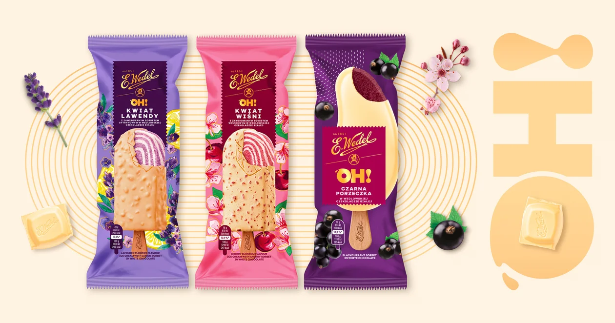 Popularność pełnych owoców sorbetów to silny globalny trend już od kilku lat. Smak, który aktualnie jest jednym z najgorętszych trendów sezonu to malina. Stąd w ofercie Wedla dostępny jest delikatnie słodki i lekko kwaśmy sorbet, składający się w 59% z przecieru malinowego i oblany oryginalną gorzką wedlowską czekoladą. Ponadto w linii lodów OH! pojawiła się nowość – sorbet z czarnej porzeczki, a także letni klasyk czyli sorbet mango. Oba to unikalny koncept Wedla – połączenie mocno owocowego smaku z chrupiącą, białą wedlowską czekoladą.