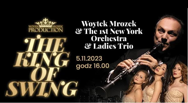 W tym unikalnym i obecnie jedynym na świecie projekcie Maestro Woytek Mrozek & The 1st New York Orchestra zaprezentują najpiękniejsze kompozycje legendarnych orkiestr swingowych: Benny Goodman Orchestra, Glenn Miller Orchestra, Frank Sinatra, Arite Shaw. Entuzjazm i niegasnąca miłość Maestro Mrozka do muzyki swingowej oddają ekscytujący, nostalgiczny i niepowtarzalny klimat muzyki początku ubiegłego wieku oraz zamieniają scenę w kolebkę muzyki z początku lat '30 i '50. „The King Of Swing“ to show, którego nie mogą przegapić zarówno fani jazzu, swingu, jak i nieuleczalni muzyczni romantycy, którzy pragną przenieść się do 1938 roku na legendarny koncert Orkiestry Benny Goodmana w Carnegie Hall w Nowym Yorku. Prestiżowe występy artytsów to błyskotliwe i precyzyjne brzmienie orkiestry i niepowtarzalna barwa klarnetu splatającego wszystkie partie w jedną całość. Energia, perfekcjonizm i autentyczność artystów sprawiły, że programy Woytka Mrozka zyskały najcenniejszą nagrodę: podziw i owacje na stojąco. W programi gościnnie wystąpią niezwykłe Ladies Trio. Barwa głosów tych artyystek idealnie wciela się w styl i klimat muzyki swingowej. Kiedy słuchacz zamknie oczy usłyszy barwy głosów Andrew Sisters czy Deana Martina.