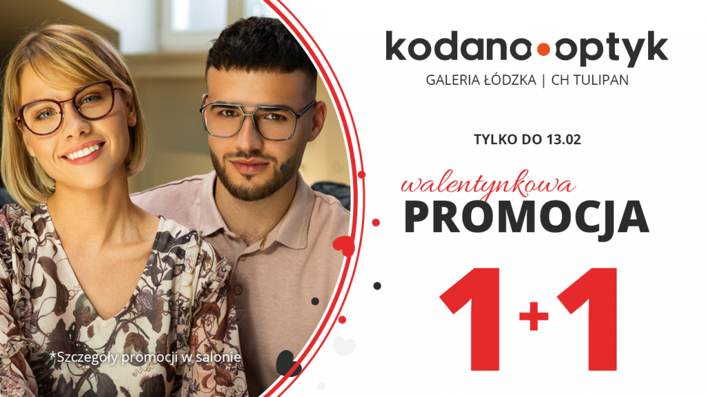Przypominamy! Tylko do 13 lutego w salonach KODANO Optyk w Łodzi trwa walentynkowa promocja : przy zakupie dowolnej pary okularów, drugie tańsze otrzymasz za 1 zł!