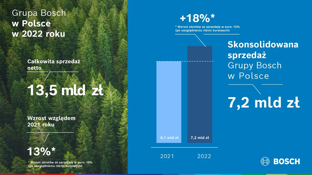Grupa Bosch w Polsce zakończyła rok obrotowy 2022 z blisko 7,2 mld zł (ponad 1,5 mld euro) skonsolidowanej sprzedaży w Polsce, odnotowując tym samym wzrost przychodów o prawie 18% (15%[] po uwzględnieniu efektu różnic kursowych) w porównaniu z rokiem poprzednim. Całkowita sprzedaż netto wyniosła ponad 13,5 mld zł (2,9 mld euro) i była o 13% wyższa niż w roku poprzednim (10%[] po uwzględnieniu różnic kursowych). „Mimo ekonomicznych konsekwencji światowego kryzysu politycznego i wojny w Ukrainie, Bosch osiągnął dobre wyniki sprzedażowe na polskim rynku 2022 roku. Udało nam się również rozbudować nasze Centrum Kompetencji IT, którego zespół powiększył się do ponad 1000 ekspertów. Rozwinęliśmy również nasze fabryki: komponentów do układów hamulcowych, sprzętu AGD i akcesoriów do elektronarzędzi, w których powiększyliśmy moce produkcyjne” – powiedział Rafał Rudziński, prezes spółki Robert Bosch i przedstawiciel Grupy Bosch w Polsce. Na dzień 31 grudnia 2022 r. liczba pracowników zatrudnionych w Grupie Bosch w Polsce wynosiła blisko 9 400 osób. Wszystkie sektory biznesu Bosch rozwijały się w Polsce pozytywnie a obszary mobilności, przemysłu i dóbr konsumpcyjnych odnotowały dwucyfrowe wzrosty.