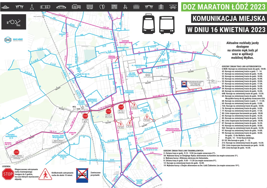 Choć dla maratończyków to świetne wydarzenie, pozostali mieszkańcy Łodzi – podobnie, jak rok temu – będą odczuwać jego organizację przez cały dzień.Ulice, które będą czasowo niedostępne, w niedzielę 16 kwietnia, dla kierowców i podróżnych MPK Łódź podczas trwania maratonu: