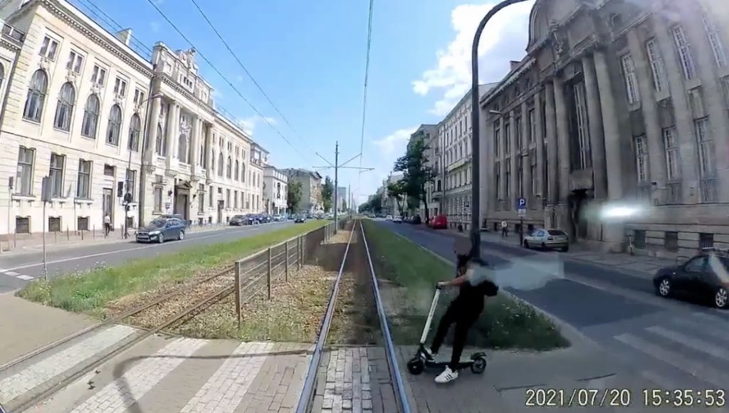 Na filmiku opublikowanym przez MPK Łódź widać, jak znajdujący się na elektrycznej hulajnodze mężczyzna najpierw przejeżdża przez przejście dla pieszych na jezdni, by po chwili podjąć próbę przejechania także przez torowisko.