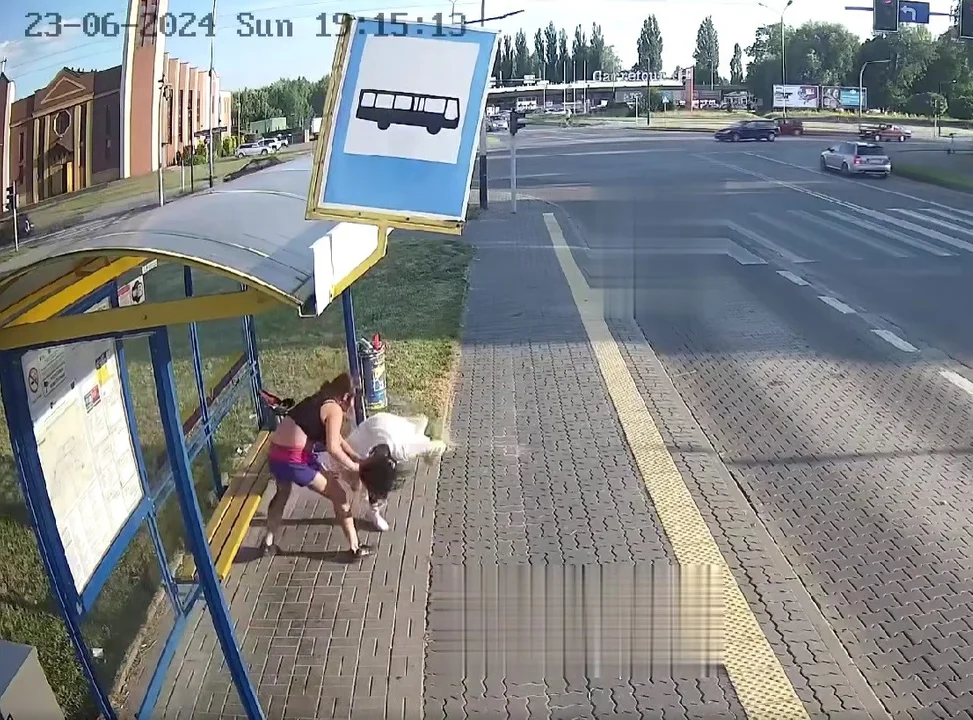Widać na nim przystanek autobusowy przy skrzyżowaniu ulic Waltera Jankego i Nawrockiego w Pabianicach. Na ławce siedzi kobieta, jest zajęta telefonem. W pewnym momencie szybkim krokiem podchodzi do niej druga, ciemnowłosa, ubrana w krótkie spodenki i koszulkę na ramiączkach. Zaczyna okładać siedzącą pięściami po głowie, w pewnym momencie chwyta ją za włosy i rzuca na chodnik. Dopiero gdy napadnięta się przewraca, sprawczyni ataku orientuje się, że się pomyliła. Na nagraniu widać, że mówi coś do poszkodowanej.