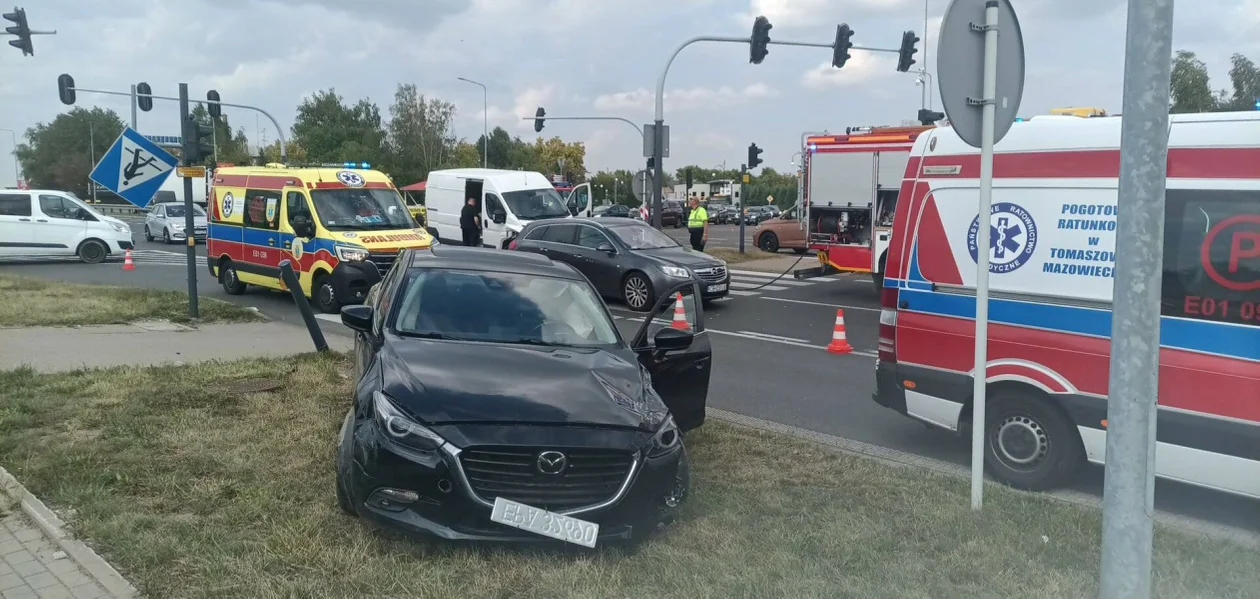 Na ul. Katowickiej w Rzgowie zderzyły się ze sobą bus i samochód osobowy. Ze wstępnych ustaleń wynika, że kierowca większego auta nie zauważył prawidłowo jadącej mazdy i podczas skręcania w lewo doprowadził do zderzenia.