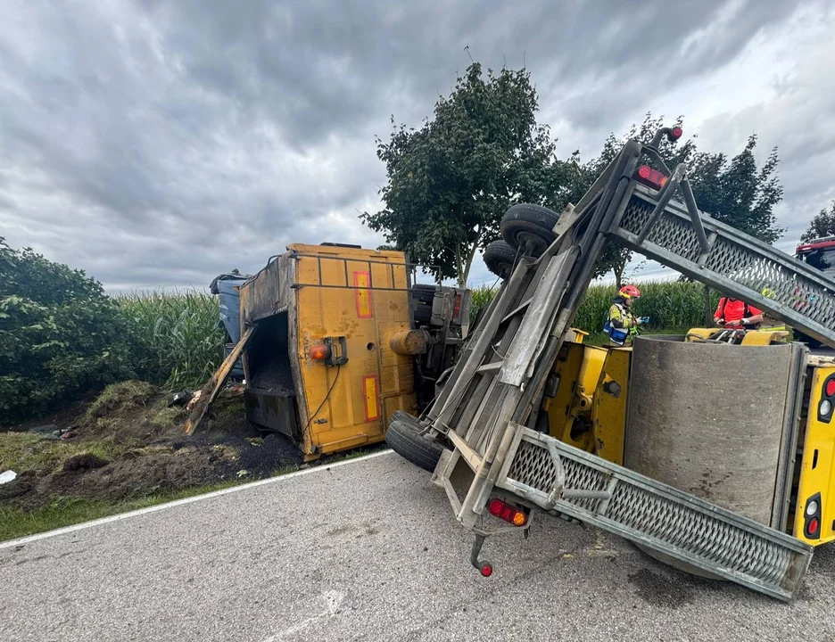 Komenda Powiatowa Policji w Pabianicach podaje, że na drodze przed miejscowością Tążewy za Dłutowem (powiat pabianicki) przewrócił się samochód ciężarowy marki Scania.