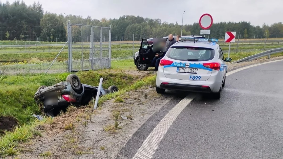 -27-kierowca samochodu nie dostosował prędkości do warunków na drodze, wskutek czego wpadł w poślizg i zjechał do rowu. Tam pojazd wylądował na dachu, z kołami w górze. Kierujący wskutek zdarzenia trafił do szpitala. Jego 52-letni pasażer nie odniósł wskutek kolizji powazniejszych obrażeń. Kierowca został ukarany mandatem karnym. Był trzeźwy