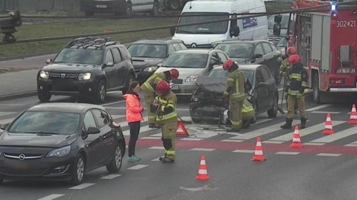 W miejscu wypadku mogą być problemy z przejazdem, ponieważ jeden pas ruchu blokuje wóz straży pożarnej, która usuwa z jezdni pozostałości po stłuczce.