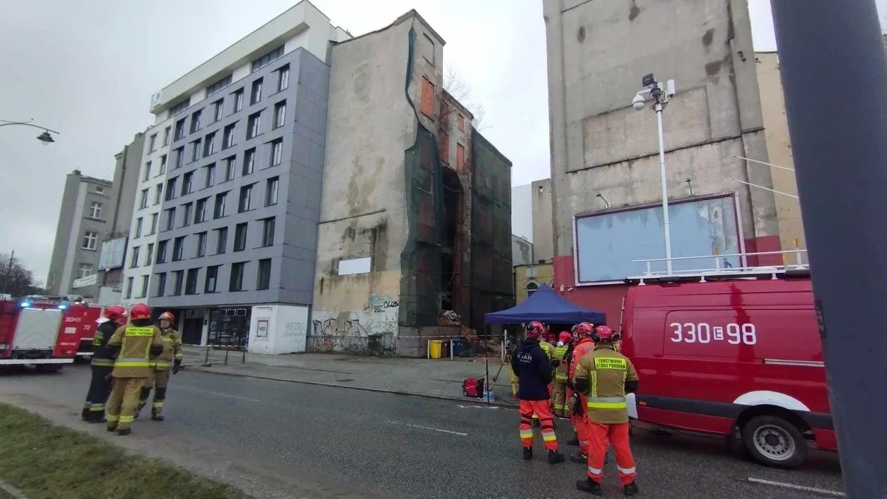 Działania strażaków skupiły się na zabezpieczeniu elewacji i ściągnięciu uszkodzonych elementów ściany, które mogłyby wkrótce spaść.