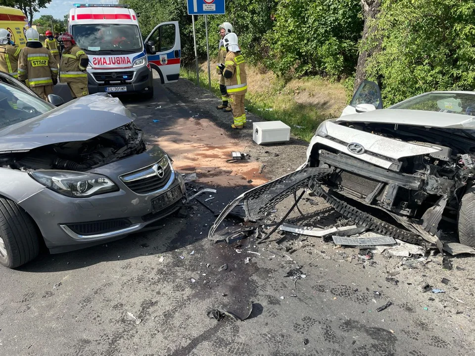 Na prostym odcinku drogi zderzyły się czołowo dwa samochody osobowe - hyundai i opel. W wyniku uderzenia ranne zostały dwie osoby podróżujące hyundaiem. 30-letni pasażer trafił do szpitala i kierująca autem kobieta. Strażacy musieli użyć specjalistycznego sprzętu, by wyciąć drzwi i ją wydostać.