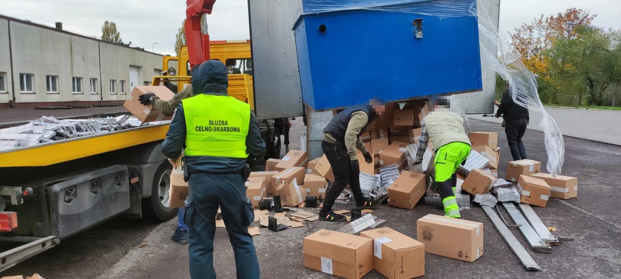 Funkcjonariusze skontrolowali dwa pojazdy na terenie Podlasia. W pierwszym z nich znajdowały się palety z metalowymi elementami konstrukcji okiennej. Pomiędzy paletami wykryli ukryte nielegalne papierosy. W naczepie drugiego auta, zgodnie z dokumentami, miały być przewożone palety ze słoikami. Po odchyleniu zewnętrznej folii znaleziono paczki papierosów.