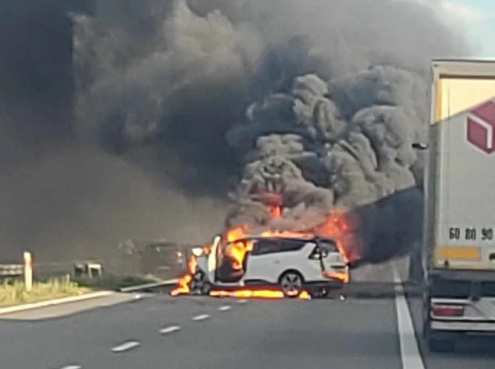 Płonący samochód na A1