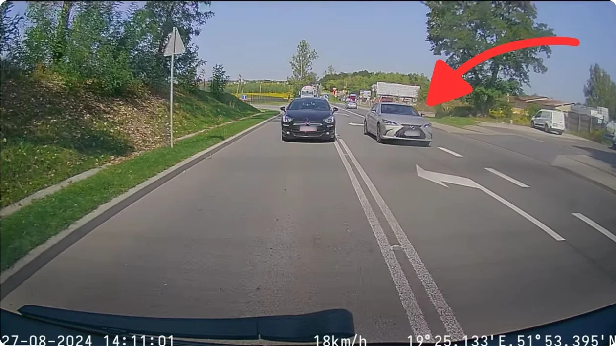 Na nagraniu widać, że kierowcy poruszają się z prędkością niespełna 30 km/h. Kierowca lexusa próbuje zobaczyć, co jest przyczyną spowolnienia ruchu, a następnie decyduje się na wyprzedzanie, przekraczając podwójną ciągłą, jadąc pod prąd w wyznaczonym miejscu skrętu i wyprzedza trzy pojazdy (w tym maszynę rolniczą), w ostatniej chwili uciekając przed samochodem dostawczym.