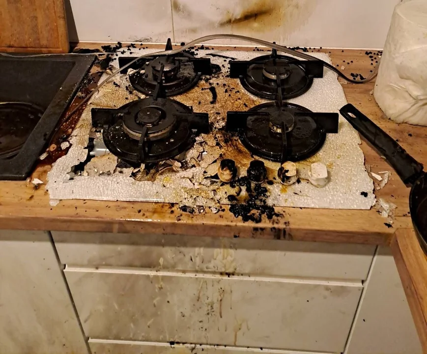 - Zalanie palącego się oleju wodą spowodowało jej natychmiastowe odparowanie i wyrzut płonącego oleju do mieszkania, co skutkowało spaleniem się części kuchni i rozległe poparzenia u 26-latka