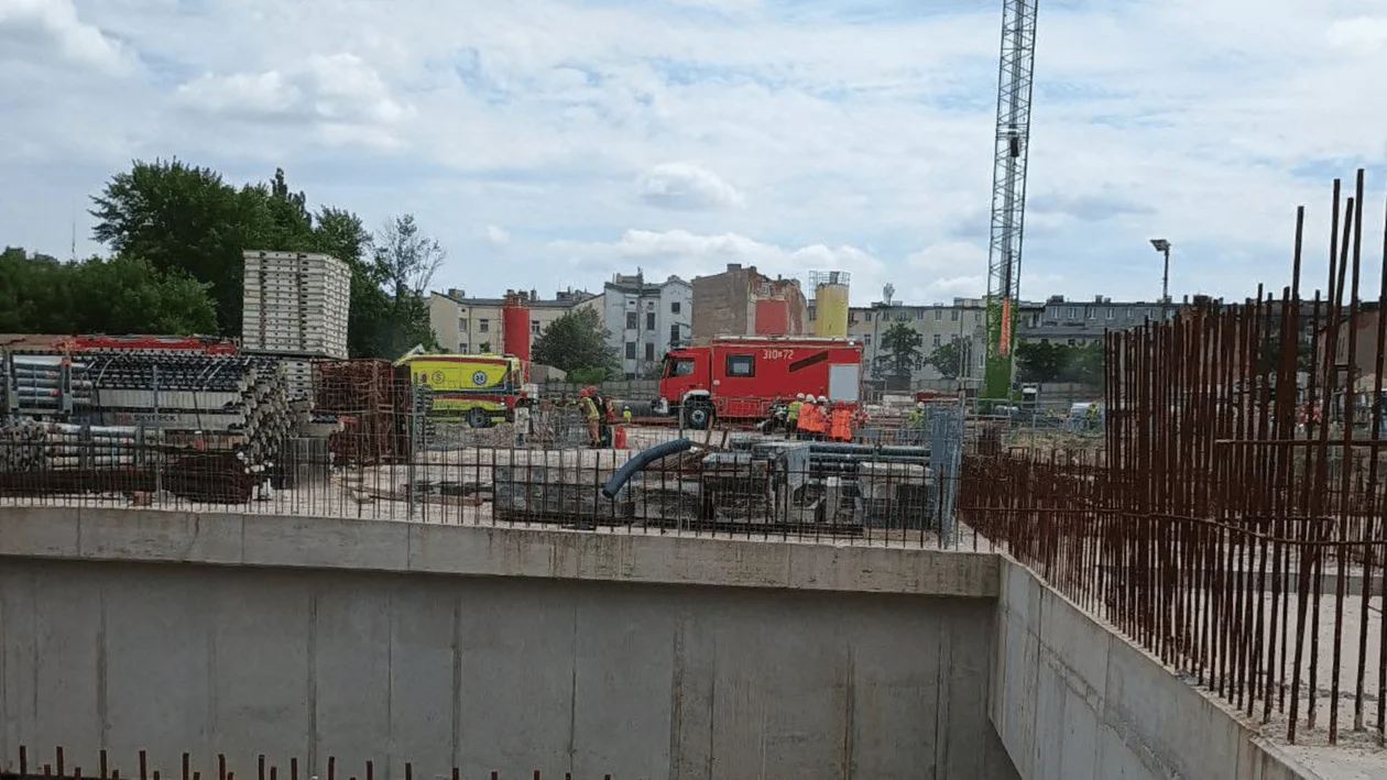 Pogotowie ratunkowe i straż pożarna przy placu budowy na Ogrodowej w Łodzi