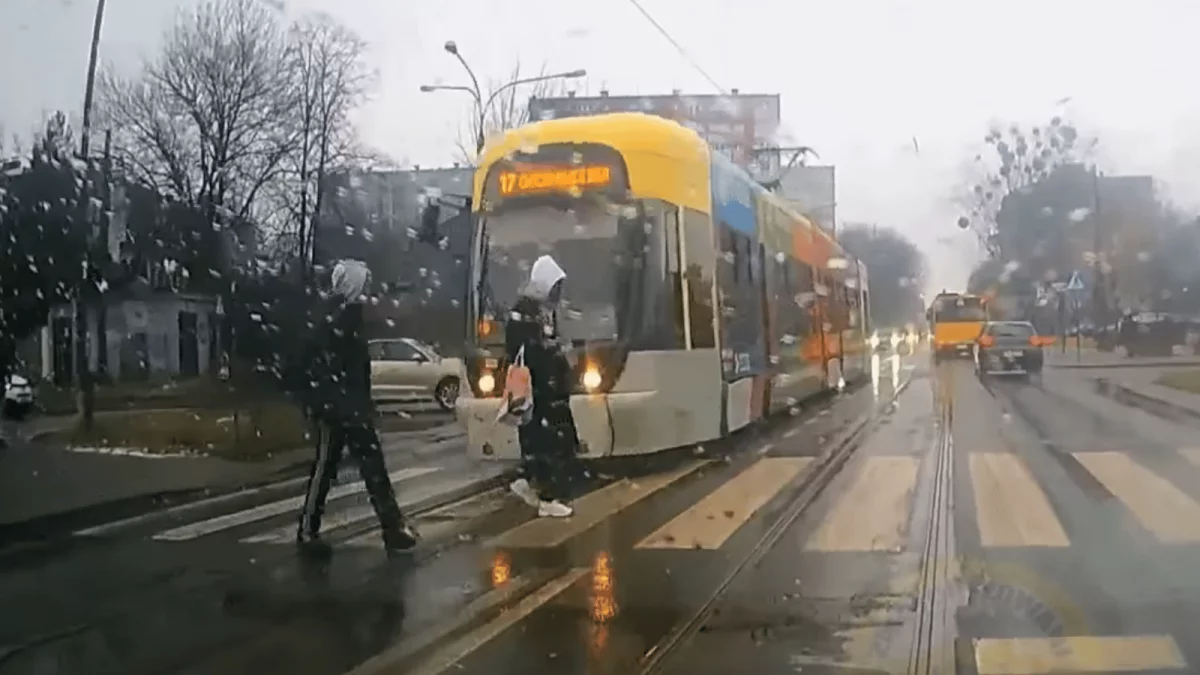 Nagranie z ulicy Pomorskiej w Łodzi - piesi kontra tramwaj MPK Łódź