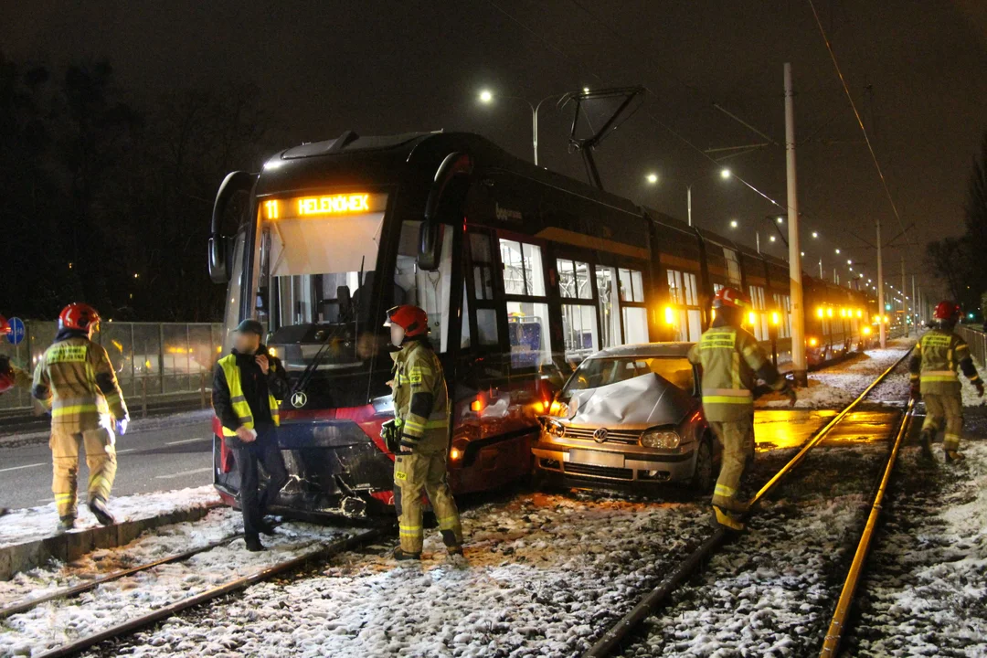 Srebrny volkswagen zderzył się z tramwajem MPK Łódź na wysokości skrzyżowania ulic Zgierskiej i Brzoskwiniowej. Ruch tramwajowy w tym miejscu został wstrzymany w obu kierunkach. Na miejsce zostały wezwane wszystkie służby.